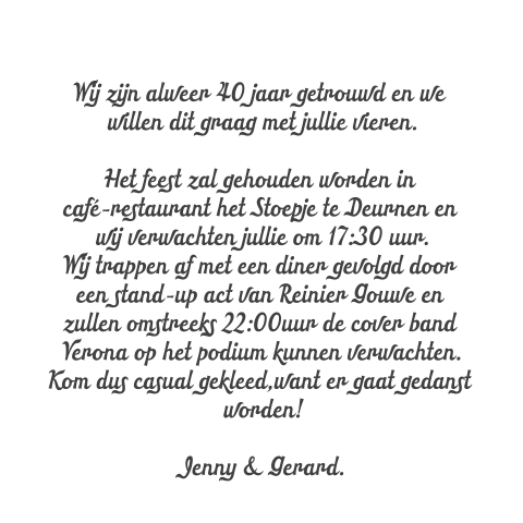 Hier kun je eenvoudig tekst toevoegen en aanpassen afbeeldingen weg halen of juist één van de vele afbeeldingen uit onze galerij toevoegen. Benieuwd hoe mooi jullie favoriete 40 jaar getrouwd uitnodiging er gedrukt uitziet. Wat doe je geef je een groot feest of juist niet.