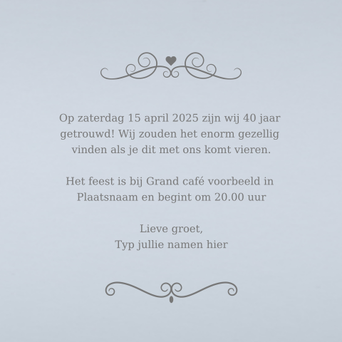 Dit willen wij graag vieren met onze kinderen kleinkinderen familie en vrienden. Wij zijn op DATUM DAG JAARTAL 40 jaar getrouwd. In feite zijn de getallen aan te passen naar elk.