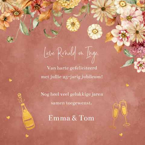 Gefeliciteerd jubileum. We wensen jullie heel veel liefde en gezondheid toe. Gebruik de pijltjes omhoog en omlaag om door resultaten van automatisch aanvullen te navigeren en druk op Enter om een resultaat te selecteren. Tijd voor een feestje.