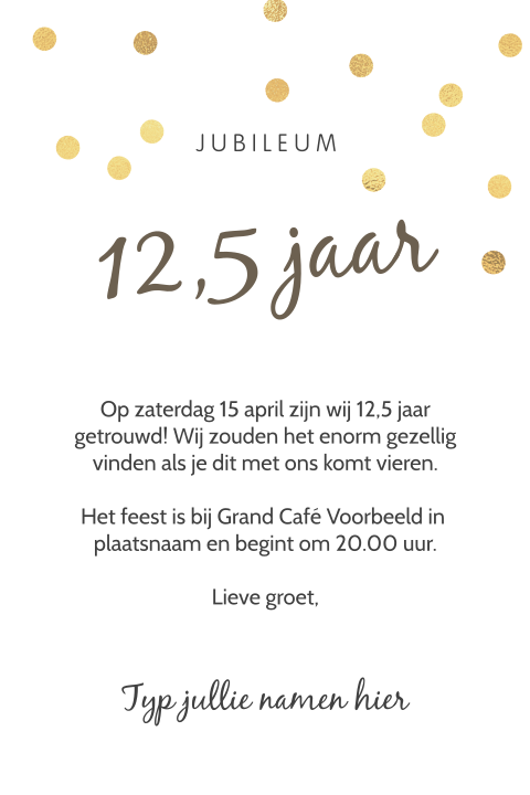 12 5 jaar getrouwd uitnodiging tekst. Maar wat schrijf je in de uitnodiging. Twaalfenhalfjaar het lijkt bijna onwaar en de liefde groeit nog elk jaar. Wij geven je hieronder een aantal voorbeelden die je in je 125 jaar getrouwd uitnodiging kan schrijven.