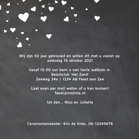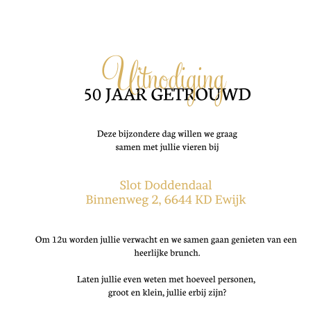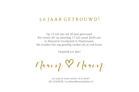Binnenkort zijn jullie 50 jaar getrouwd. Ontvangst tussen TIJDSTIP en TIJDSTIP. Vanaf 160 pst.