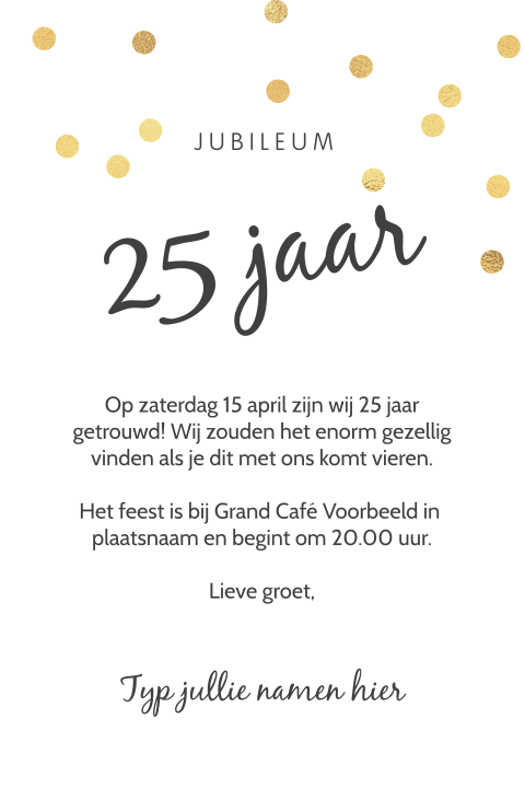 Als je je 25 jarig huwelijk viert dan is het leuk om een groot feest te geven voor je vrienden familie collegas buren en alle andere mensen die jullie dierbaar zijn. Zo vertel je in de tekst hoe laat het feest plaats zal vinden en wat jullie op deze nog meer gaan doen. De uitnodiging voor een huwelijksjubileum maak je eenvoudig en snel in onze kaartmaker.
