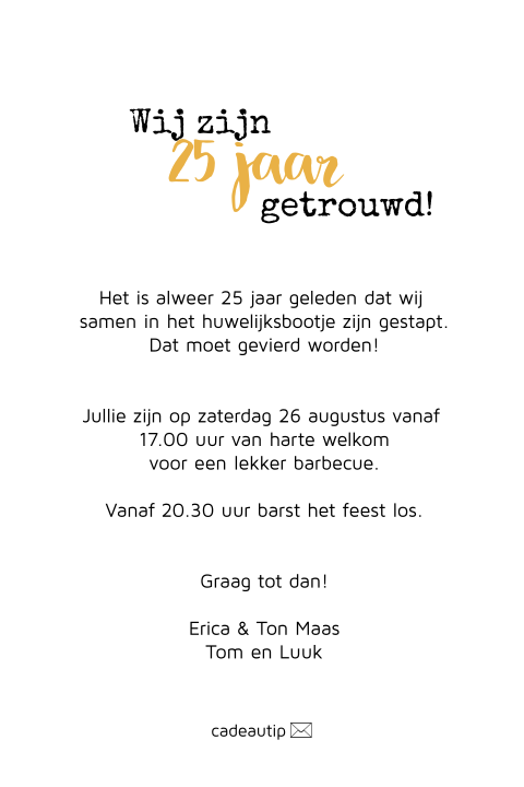 Kaarten 25 jaar getrouwd uitnodiging. Het maakt eigenlijk niet zo veel uit wat voor uitnodigingskaart je gebruikt deze tekst kun je overal kwijt. Jep de tekst voor je uitnodigingen 25 jaar getrouwd blijft nog wel het lastigste puntje. Ruime keus aan feestelijke afbeeldingen.