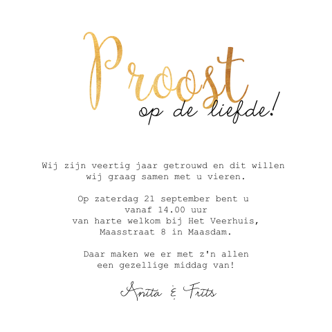 Volgend jaar word je 50. Op deze pagina vind je verschillende designs voor jouw uitnodiging die je zelf kunt aanpassen in de online opmaaktool. Je kunt ook je kaart helemaal zelf ontwerpen en maken. Het is geen gewone verjaardag maar een jubileum.