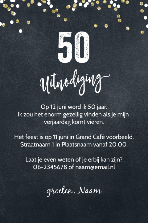 Je maakt je uitnodiging helemaal zoals jij m wilt bij Kaartje2go. Uitnodigingstekst verjaardagsfeest 50 jaar. De uitnodiging verjaardag abraham of sarah pas je eenvoudig aan in onze editor.